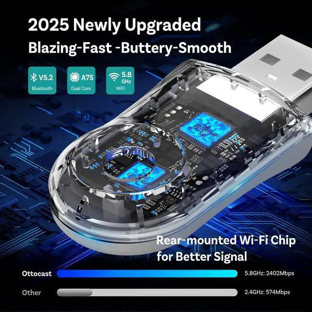 Ottocast Mini Wireless CarPlay Android Auto AdapterUpgrade your car with the Ottocast 2in1 wireless CarPlay adapter. It cranks out CD-quality audio through 5GHz WiFi for iPhone iOS 10+ and Android 11+, delivering sound 10x sharper than basic Bluetooth. Sleek design with REAL WIRELESS TECHkick those cables to the curb and embrace pure wireless vibes! Perfect match with 98% of cars that supports Wired CarPlay/Wired Android Auto(Not for BMW/Tesla). ^^ Blazing-Fast ConnectivityThis CarPlay Android Auto wireless adapter is loaded with 5GHz WiFi, Bluetooth 5.0, and a next-gen chip for lightning-fast 10s setup and a buttery-smooth 5-second Auto-Reconnect.