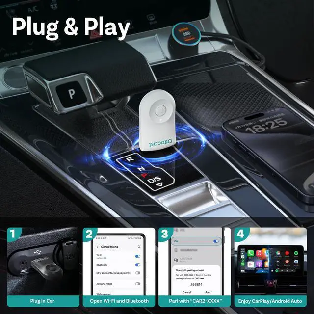 Get 3x faster speeds, silky performance, and glide through navigation, music, calls, and messages via Siri, touchscreen, or buttons. Rock-Solid connectionwhether you're road-tripping coast to coast or hitting low-bars areas, the OTTOCAST MINI keeps the good times rolling. ^^ Plug and Play, Auto-ReconnectKeys in? Car connects! Setup's smoother than a fresh jar of