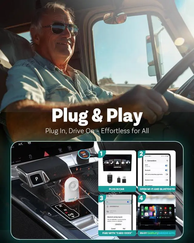 ^^ [Effortless Wireless Upgrade]: Enjoy CarPlay or Android Auto without plugging in your phone. Connects in 58 seconds, giving you instant access to navigation, calls, and music the moment you start the car.