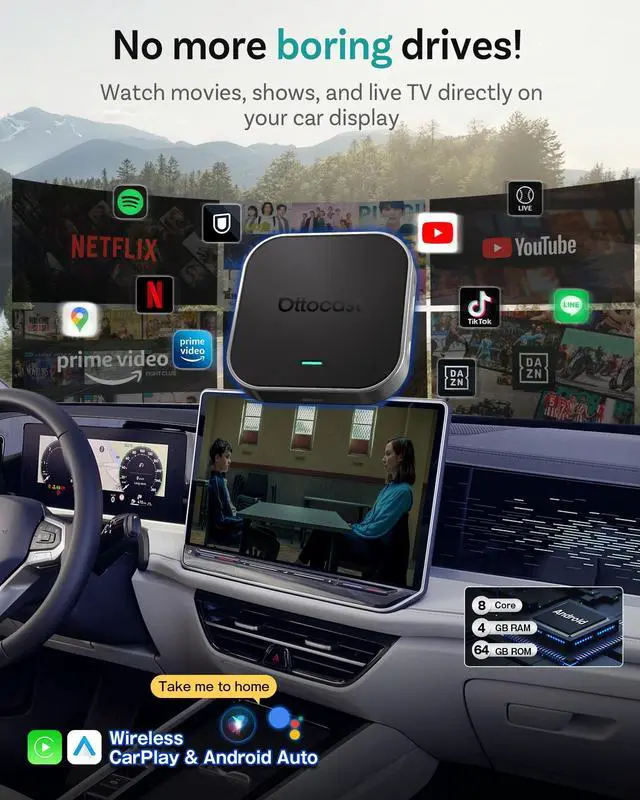 Blazing-Fast Performance Powered by the Android 13 system, this Ottocast smart AI box transforms your car screen into a smartphone-like device. No more lag, black screens, or random restartsjust instant response and stable performance, even on long drives. ^^ Immersive In-Car Entertainment Turn your car into a personal cinema and sports hub. Watch Netflix originals, binge shows, stream Hulu dramas, or catch live sports like the NFL, NBA, and even the Super Bowlall with audio seamlessly integrated into your car OEM sound system. ^^ Split-Screen Multitasking, One Screen Double Fun More than just a car video player, this car streaming box supports true split-screen multitasking.