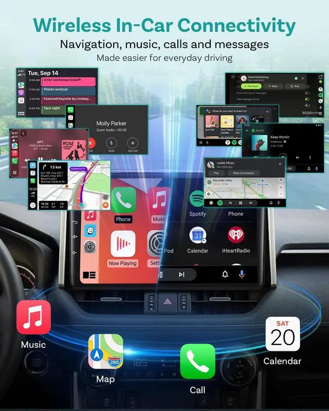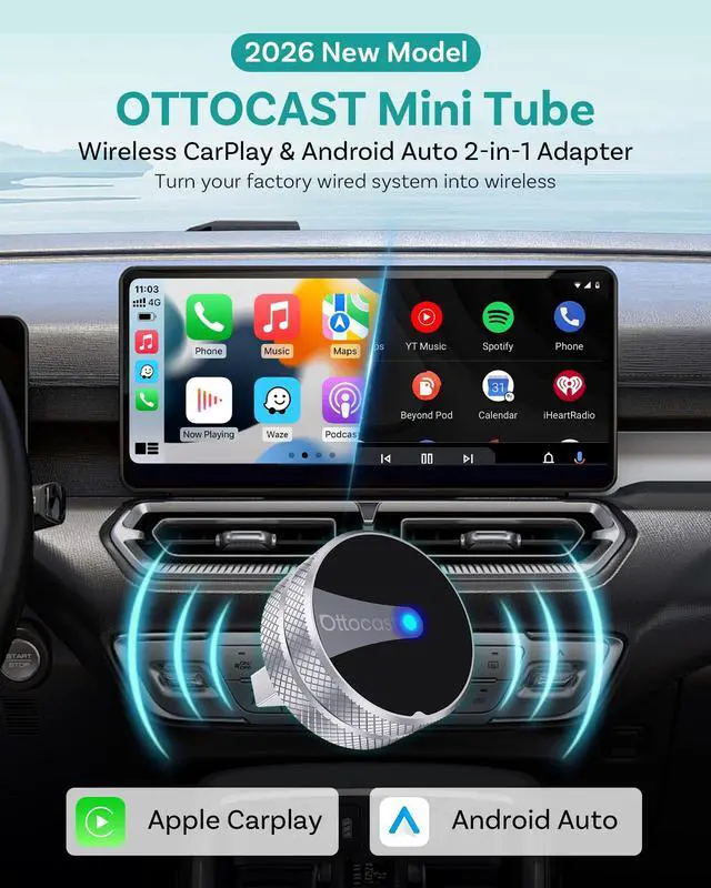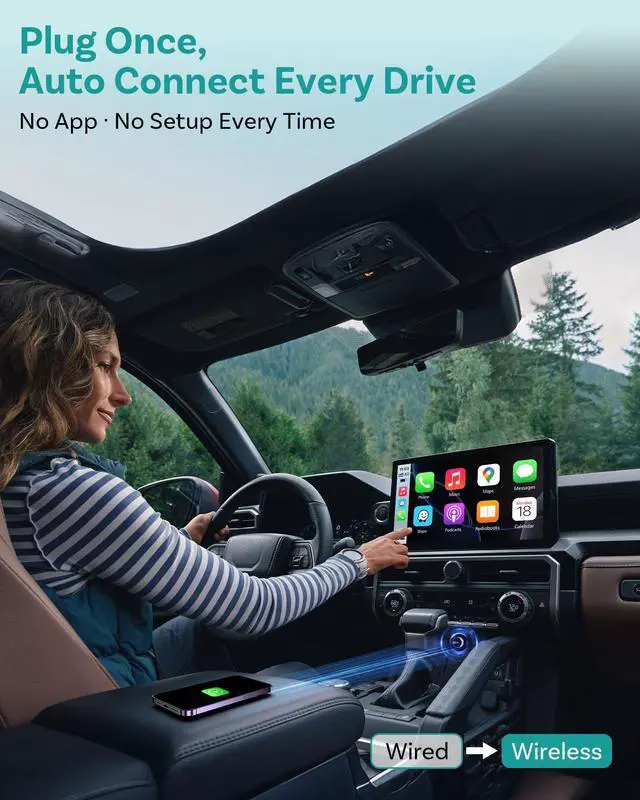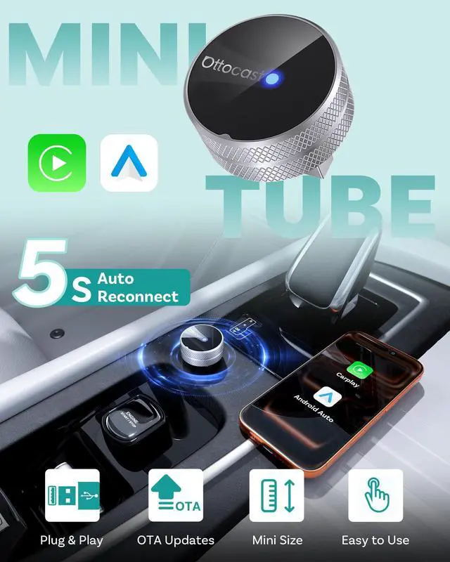 A Smarter Upgrade to Your Existing CarPlayOttocast wirelessly upgrades your factory CarPlay system without changing how you use it. Get in, start driving, and CarPlay connects automatically. No cables. No extra steps. ^^ Designed for Long-Term StabilityAdvanced A9 chip processing, 5GHz WiFi, and optimized Bluetooth ensure reliable performance even on long commutes and road trips. Navigation, calls, and music stay connected when you need them most. ^^ Truly Plug & PlayNo apps. No settings. No learning curve. If your vehicle already supports wired Apple CarPlay, Ottocast is fully compatible and ready to use.