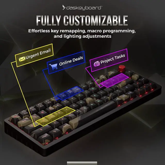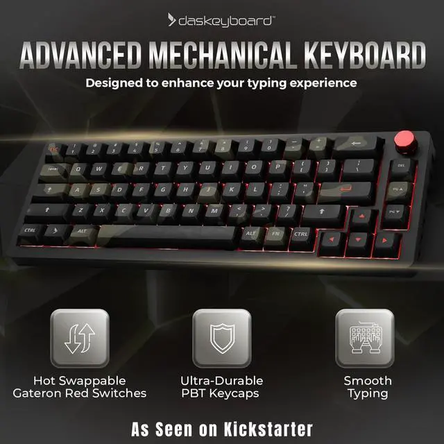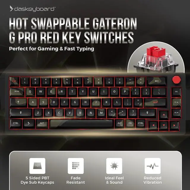 Key Features: 65% compact mechanical keyboard for a streamlined, space-saving design Hot-swappable Gateron Red switches for smooth, responsive keystrokes PBT sublimation keycaps for durability and long-lasting legends CNC aluminum frame & gasket mount for premium typing comfort RGB backlighting with QMK/VIA support for advanced customization Multi-layer sound-dampening padding for a refined typing soundWhether you're a gamer looking for a custom mechanical keyboard, a professional in need of a programmable keyboard, or a typist who values premium materials and comfort, the DAS Keyboard 65% is the ultimate solution. Upgrade your setup with a high-quality, high-performance keyboard today.