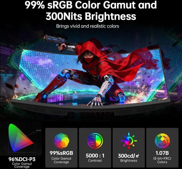 Wide Color Gamut: 99% sRGB color gamut coverage, 126% sRGB color volume, and 5000:1 contrast ratio provide more vivid colors, deeper blacks, and brighter colors. HDR10 provides vivid, lifelike images.