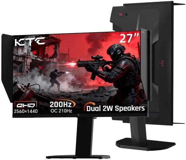 Sharpest and Clearest VisualsThis KTC monitor 27 inch with speakers features a fast ips panel with native 2560 x 1440 QHD resolution, providing better image sharpness. The built-in dual 2w speakers provides you big convenience without the clutter. ^^ Smoothest Gaming ExperienceCatch every detail of motion and enjoy the most fluid gameplay by KTC 27 inch 210hz gaming monitor, which ensures a flawless view of fast-motion consistently. Fast response time of 1ms (MPRT) enhances gamers in-game experience. ^^ Prefessional True-to-life ColorsThis 1440P PC monitor features 130% sRGB color gamut area, 1.07 billion colors, 1000:1 contrast ratio, 450cd/ brightness as well as HDR support, which producing amazingly accurate colors, ideal for color-critical projects.