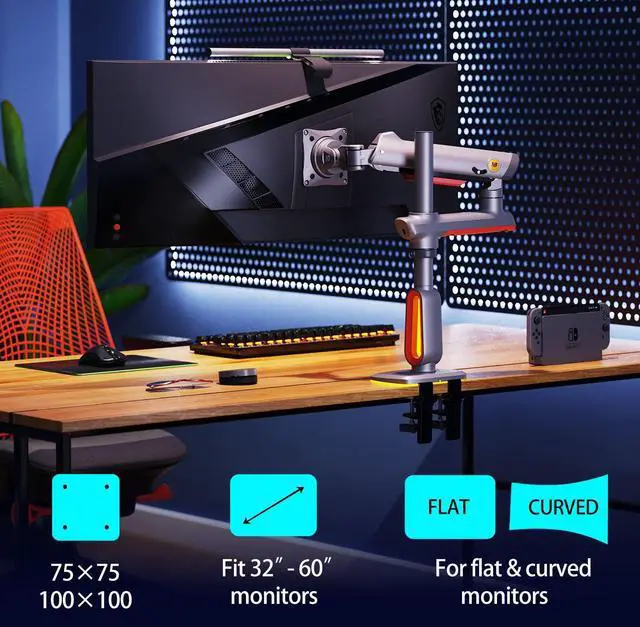 Fits Ultra Wide Screens, Single mount for ultra-wide monitors up to 60" in size and 44 lbs in weight monitor stand with strong mechanical spring for most Flat / Ultrawide / Curved monitor screen, with 75x75mm or 100x100mm VESA patterns.