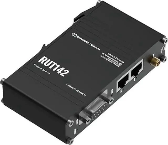 Teltonika RUT142000000 Model RUT142 Industrial Router; RS232 for Serial Communication; Integrated DIN Rail Bracket; 3-pin Power Connector; 2x 10/100 Mbps Ethernet Ports; Wi-Fi 4; Aluminum Housing