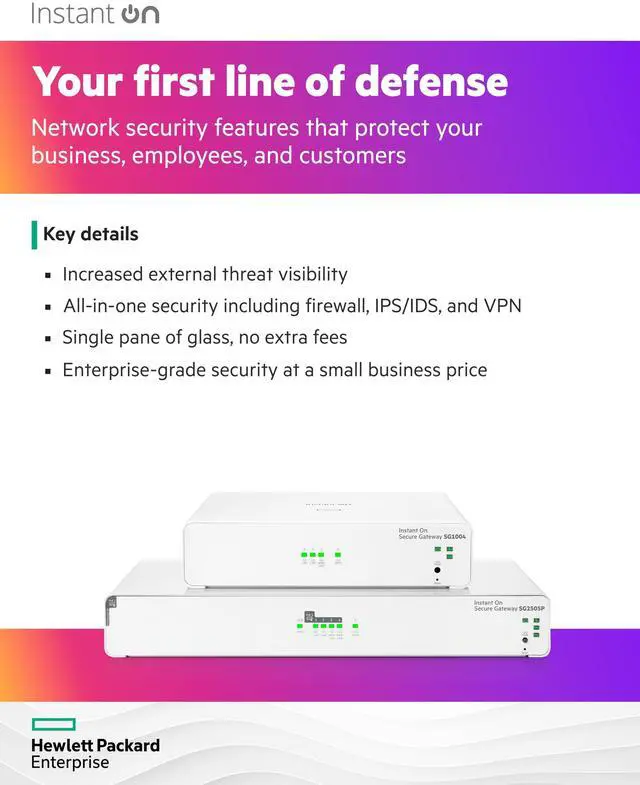 The Instant On Secure Gateway SG1004 is a great device for small and medium businesses to safeguard their business network from external threats. Support for up to 940Mbps of network throughput is achieved with hardware acceleration and all security settings in active mode. Ideal for smaller footprints or lower ISP bandwidth, the SG1004 keeps your employees, business, and customers safe from cyber threats.