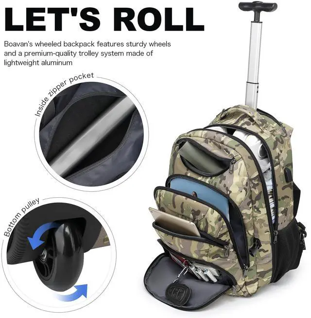 Boavan Rolling Backpack, 17 inch Water Resistant Wheeled Backpack, Carry on Luggage Business Bag, Overnight College Computer Backpack Trolley Suitcase for Men Women Adults to Travel