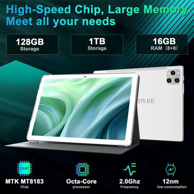[16+128GB ROM Upgraded Large Memory] Tablet comes with 128GB ROM, upgraded large memory to meet your various apps needs. 16GB RAM of this android tablet provides faster running speeds (8+8 virtual memory expansion). Tablets also supports TF card expansion of up to 1TB. Get rid of ads and download apps from Pre-installed Play like NetFlix, TikTok, Games and more.