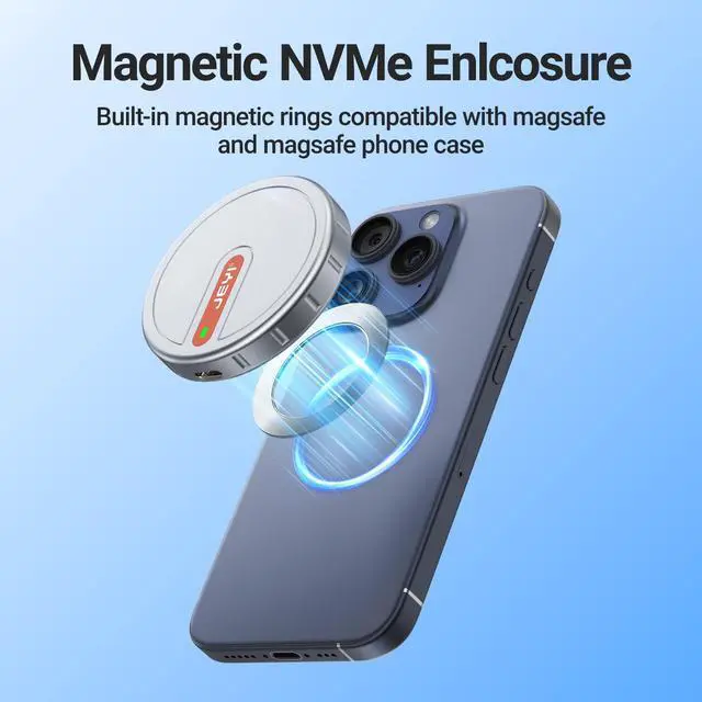 Perfect MagSafe Compatibility, Expands iPhone Storage up to 2TB: This JEYI NVMe Enclosure features a built-in magnetic structure, making it the ideal solution for adding up to 2TB of storage to your iPhone. Experience easy snap-on use the case securely attaches to your phone via magnetic force.