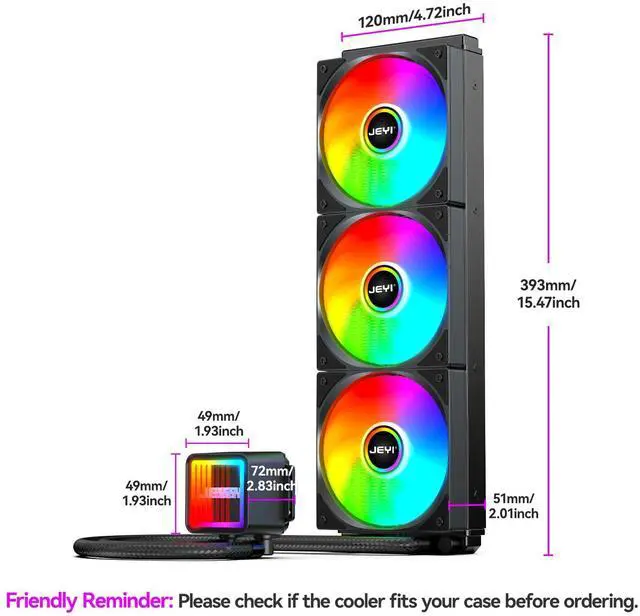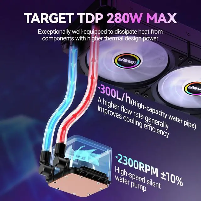 Efficient and Quiet PumpThe built-in powerful JEYI liquid cooler cpu pump operates at up to 2300 RPM and works with a 16mm large-diameter tube to achieve a 300L/h flow rate, efficiently circulating refrigeracion liquida 360mm for low temperatures and quiet operation, balancing performance and silence.