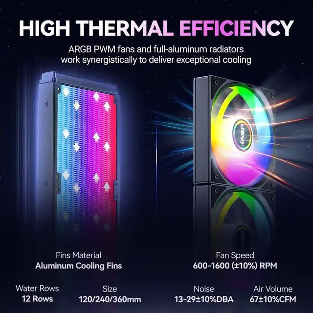 Outstanding Cpu CoolerEquipped with a 4th-generation high-efficiency pump head and a 360mm large radiator, combined with thickened aluminum cooling fins and reinforced tubing, it significantly enhances heat transfer efficiency. Features low-noise ARGB fans that deliver powerful airflow and low-vibration operation, greatly extending the liquid cpu coolers lifespan while providing consistent high-performance liquid freezer.
