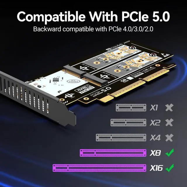 Only support Bifurcation Motherboard otherwise only one drive will be read. Support high and low profile bracket cabinet ^^ This adapter card uses 3.3V and 12V dual voltage power supply, 12V to 3.3V using dual 6A power modules to meet the power requirements of large power consumption SSD. ^^ Supports 2 X NVMe M. 2 up to 128 Gbps in one card by utilizing PCIe 4. 0 bandwidth. Support 2242/ 22608/ 22110. ^^ NVMe soft RAID is supported base on the motherboard chipsets ^^ For more information please see the PRODUCTS DESCRIPTION