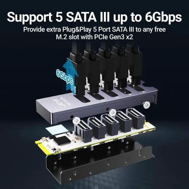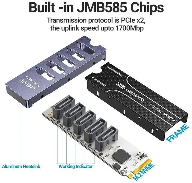 Add 5 SATA to a M. 2 NVMe slot, support PCIe 3.0 x2, providing up to 1700 MB/s Speed. ^^ Plug and play, no driver required, support UASP / TRIM ^^ Supports 5-drive software RAID group ^^ Compliant with PCI Express specification Ver. 3.1 a ^^ Compliant with SATA specification version 3.2 ^^ Supports command-based and FIS-based port doubling ^^ Supports PCI Express Physical Layer power saving mode ^^ Supports AHCI mode and IDE programming interface ^^ Supports Native Command Queuing (NCQ) ^^ Support SATA power saving mode (partial and hibernation)