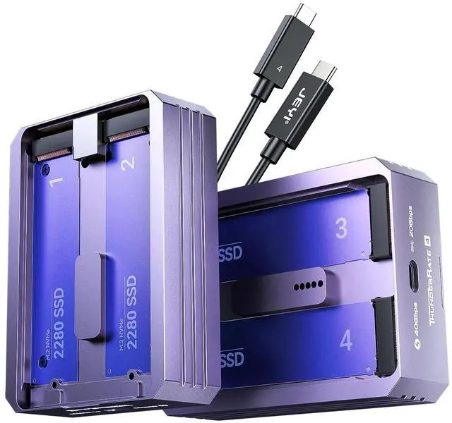 The installation of four 2280 NVMe SSDs in this JEYI Quad NVMe Enclosure, which supports USB 4 at 40 Gbps, expands capacity to 8 TB. Supports 4 M. 2 SSDs up to 32 TB. Backward compatible with Thunder-bolt 3/4.