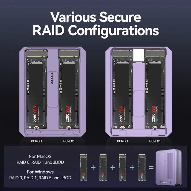 ^^ Supports RAID Functionality: Optimize your storage with flexible RAID configurations (RAID 0, RAID 1, RAID 5, and JBOD) for enhanced speed, redundancy, or capacity. Compatible with macOS (RAID Assistant), Windows (Storage Spaces), and Linux (mdraid/mdadm) ^^ The aluminum enclosure provides better protection and maximizes cooling efficiency, featuring an integrated temperature control system and a disk health monitoring system. ^^ Must be paired with a 60W power adapter to function properly. Includes a 50 cm USB 4/Thunder-bolt 4 cable and a 12V 3A power adapter. ^^ Supports four 2280 NVMe SSDs, with each SSD allocated exclusive PCIe 3.0 x1 bandwidth. The four SSDs share a total PCIe 3.0 x4 bandwidth (USB 4 and Thunder-bolt 3 at 40 Gbps) ^^ Plug & Play. Four-disk speed up to 3700 MB/s; single-disk speed is 3700 MB/s. ^^