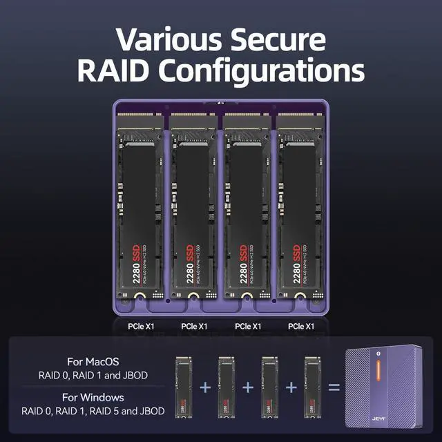 RAID ConfigurationsMac system: Supports RAID 0, RAID 1, and JBOD;