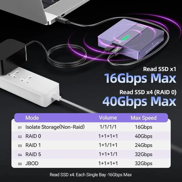 Important Note: To configure RAID, you must use USB4 or Thunderbolt interface. If you use a standard USB connection, the hard drive will be recognized as an individual volume and cannot be used to form a RAID. ^^ High Efficiency Cooling All-aluminum casing + turbo fan + thermal pads, with a 40% increase in cooling efficiency. The buttons allow for three-click switching between on/off, low, medium, and high speed modes. The color of the lights visually distinguishes the speed, ensuring long-term stable operation of the device. ^^ 32TB Ultra-Large CapacityEach single drive supports up to 8TB NVMe M. 2 2280 SSD (compatible with M-Key/B&M Key), and the total capacity of 4 ssds can reach 32TB, meeting professional-grade large-capacity storage needs. ^^ Important