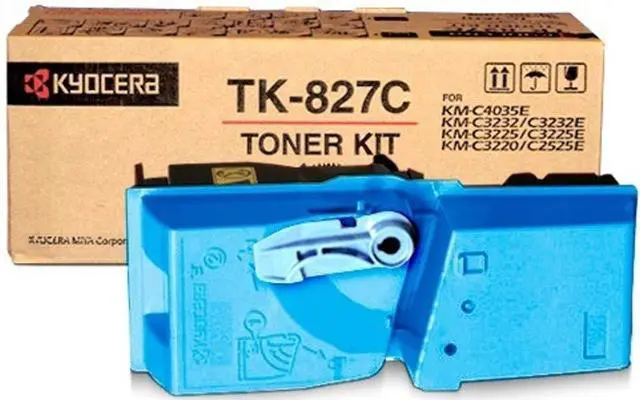 Kyocera 1T02FZCUS0 Model TK-827C Cyan Toner Cartridge with Waste Toner Bottle; For use with KM-C2520, KM-C2525E, KM-C3225, KM-C3225E, KM-C3232, KM-C3232E and KM-C4035E Printers; Up to 7000 Pages YieldKey Features- For use with KM-C2520, KM-C2525E, KM-C3225, KM-C3225E, KM-C3232, KM-C3232E and KM-C4035E Printers- Genuine Kyocera- Up to 7, 000 Pages Yield at 5%