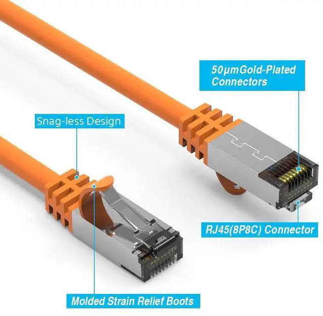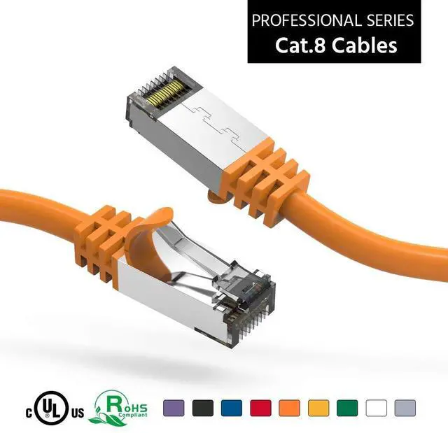 Features: 4-pair STP (shielded Twisted Pair) 100% 26 AWG pure & thick braid shielded twisted pair (STP) cable. Support bandwidth up to 2000MHZ and 40Gbps data transmitting speed. TIA/EIA-568-C. 2 by UL, ETL and RoHS Compliant Cat. 8 standards. RJ45 plug with 50-micron gold plated contacts and strain-relief boots. The first future proof, cost-effective, high-performance solution, besides Cat. 8 patch cables. The snag-less bubble design locking tabs on the RJ45 connectors from being damaged or accidentally snapped off.