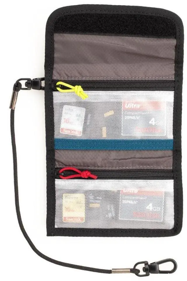 The Reload Universal memory card wallet carries up to 8 CF cards, 12 SD cards or unlimited Micro SD cards. Two pockets with yellow and red zippers allow multiple memory card styles to be sorted by Empty and Full status. The wallet has a velcro loop to attach to a belt, shoulder strap, backpack harness or other MOLLE-compatible loops to keep memory cards close at hand. The included security cable connects to a D-ring on a bag or tripod for safety. A clear pocket on the back provides storage for business cards.