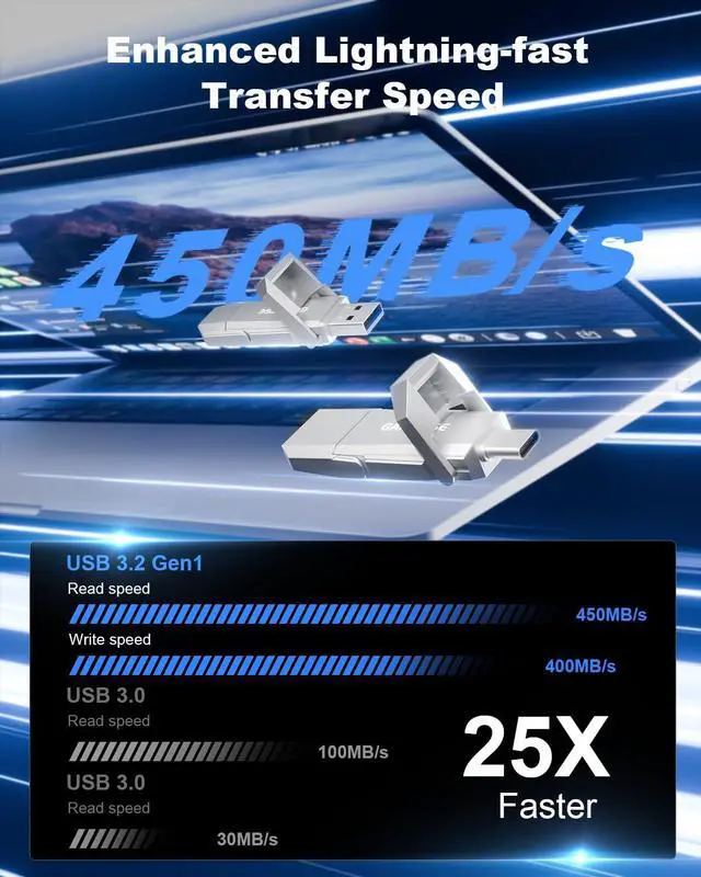 [(Enhanced Performance)] Boosting the read and write speed up to 450MB/s and 400MB/s, this USB 3.2 flash drive enables quick backup and access to large datasets, high-resolution videos, and images, significantly enhancing efficiency and productivity
