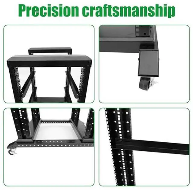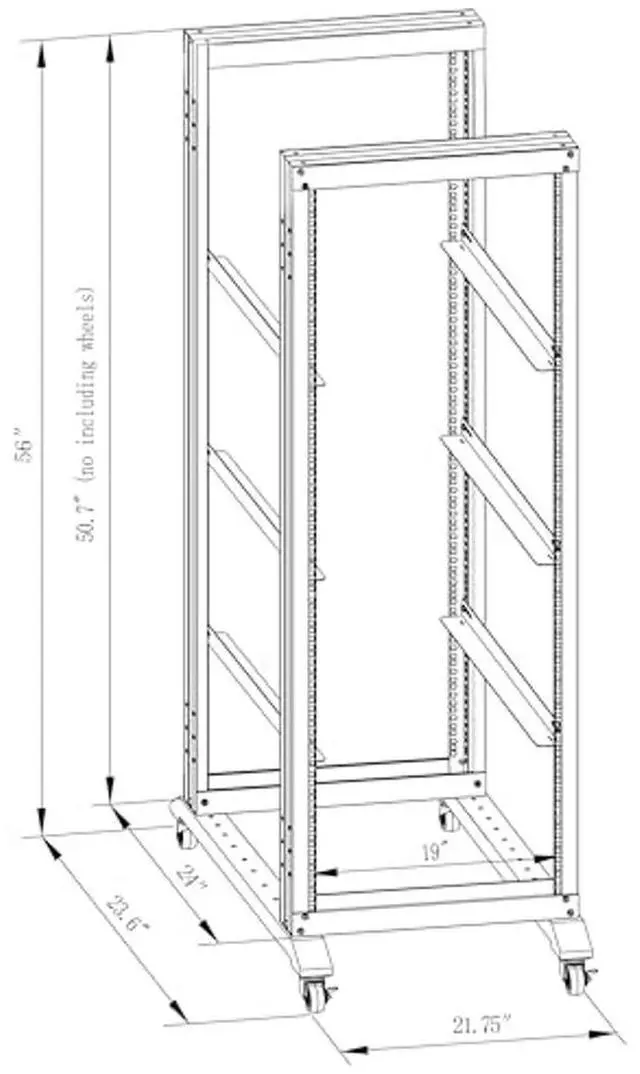 Solid, Versatile, and Premium Quality Made; Organize and Secure your Mount Equipment. This premium quality Wheeled movement 4 post open rack is designed to accommodate different installations for equipment from different manufactures. Installation depth 24in, This rack is made of Cold Rolled Steel to provide you with a maximum load of 1100LB. Available in variety heights and depth. Screws and cage nuts are included. Package contains 3 pairs of supporting L rails(22").