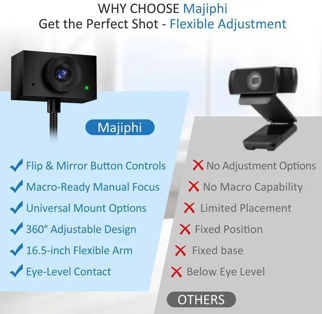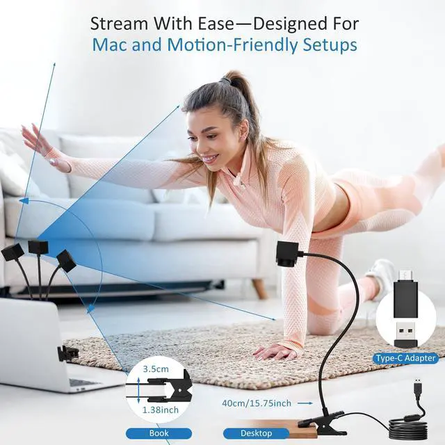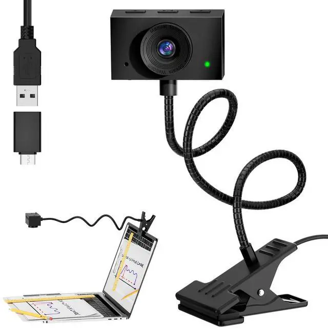 [(Key Differentiators for Superior Performance)] 1Precision Gooseneck: Optimally designed for flexible bending and stable positioning. 2Manual Focus: Ensures sharp focus for macro shots and movement without blurring. 3Rotating Button: Convenient for capturing documents or desktop items. 4Versatile Clamp: Can be used on screens, desks, books, and lamp stands. 5Noise-Canceling Microphone: Reduces background noise, especially useful for Zoom, Skype, and YouTube. 6Thoughtful Details: Includes a stylish privacy cover and a portable velvet bag.
