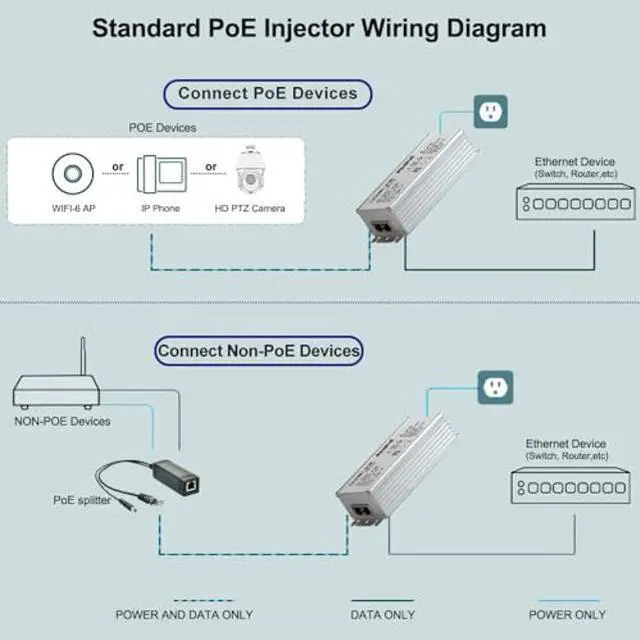 Feature: This PLUSPOE 10 Gigabit PoE injector adapter allows an PoE enabled device to be placed 328ft away from a power outlet. Ethernet terminals such as wireless LAN access point, IP phone, and web camera are powered remotely.