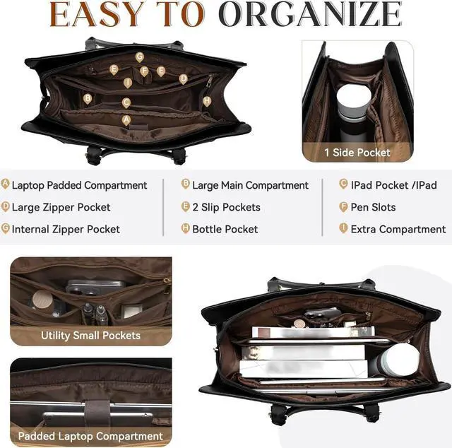 Crafted from premium faux Epsom leather, this women's work tote exudes sophistication with its classic design and golden hardware. It features a spacious main compartment with a zippered closure, a padded laptop sleeve for 15.6 -inch laptops or tablets, and additional pockets for pens and essentials. The adjustable round top handles and a detachable long strap offer versatile carrying options, while a leather key tag adds convenience. Ideal for work, college, business trips, or travel, this stylish and durable laptop work tote makes an excellent gift choice for women.