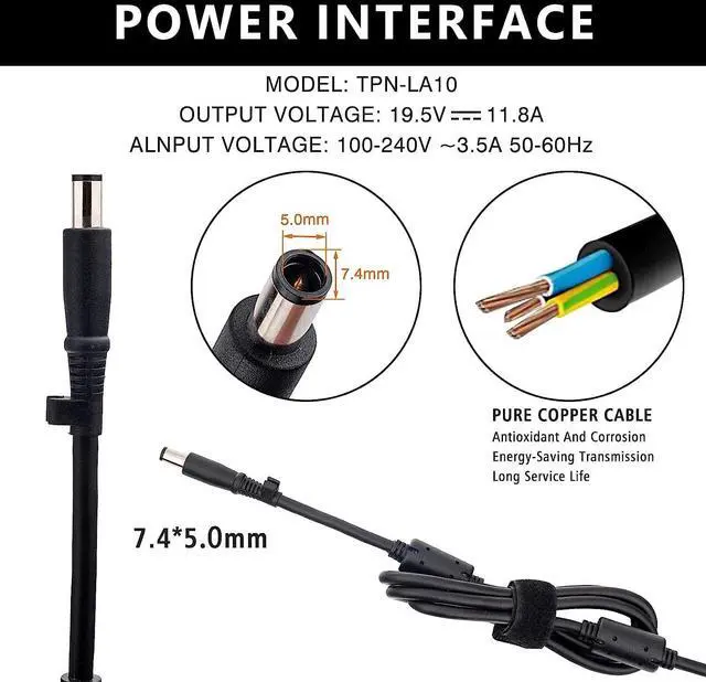 Power Product Type :100 ~ 240V 50 ~ 60 Hz ,DC Output Max: 19.5V ~ 11.8A 230w 7.4*5.0mm black tip. !!! Please Note !!!( not fit the laptops use 4.5*3.0mm Blue Connector)