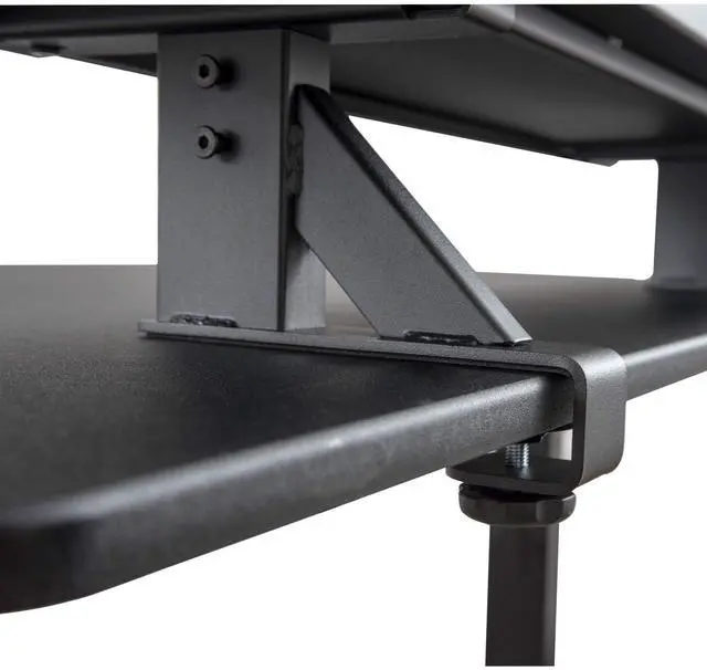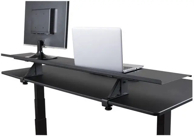 The Stand Up Desk Store Clamp-On Adjustable Height Desk Shelf Monitor Stand - Black, 60" reduces clutter on your standing desk while placing your monitors at a comfortable height. Features include easy, tool-free attachment to the rear edge of your desk and adjustable height for personalized ergonomics. Overall dimensions are 59" W x 11.25" D x 5" to 7" H. 60 lb. weight capacity. Made of powder-coated steel. 5-year limited warranty against defects. Stand Up Desk Store is based in the suburbs of Chicago.