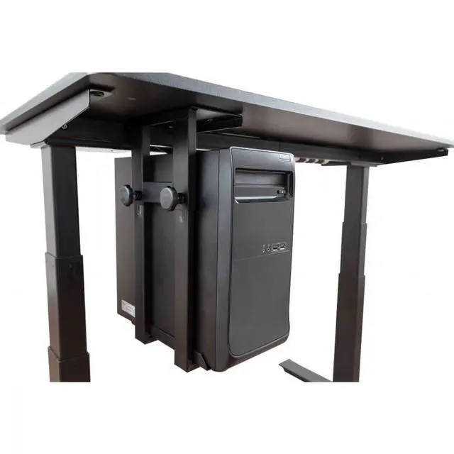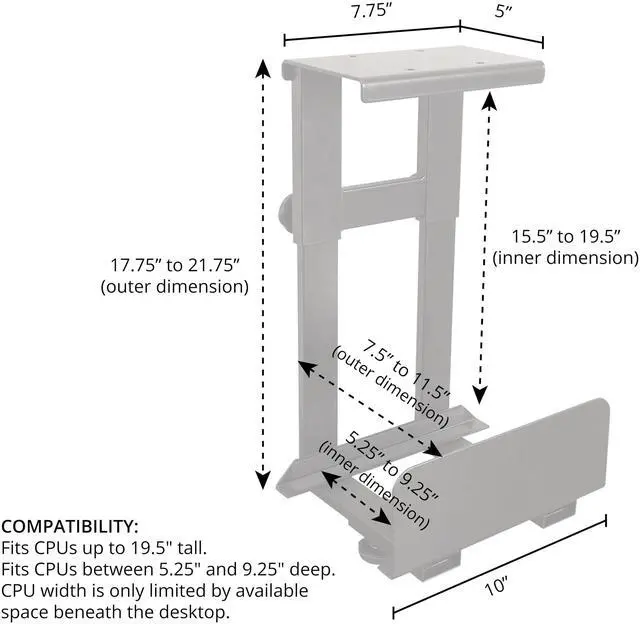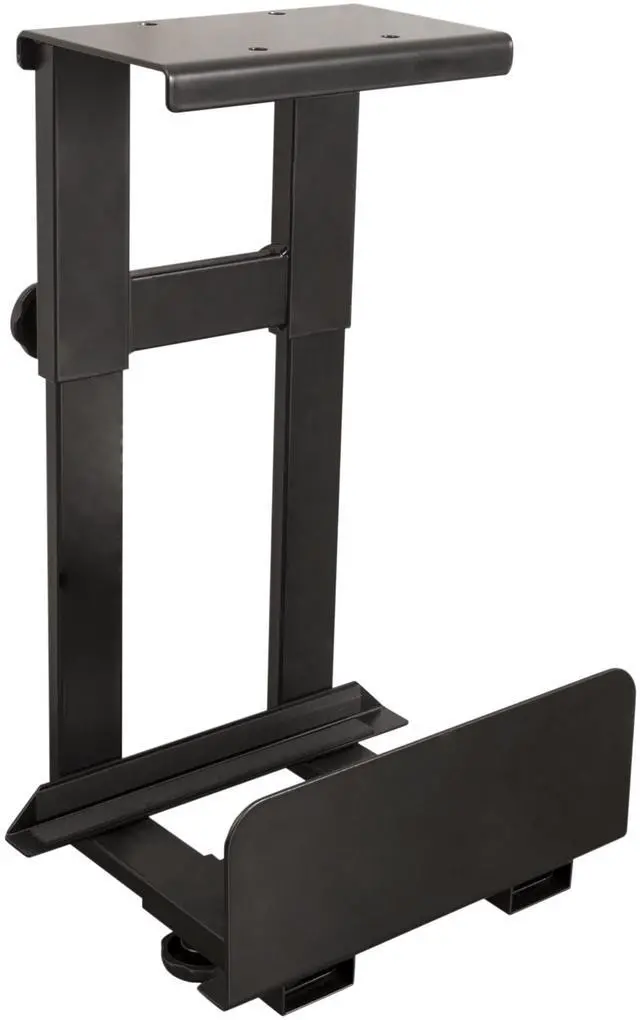 Provides a convenient place to hang a CPU under your desk, freeing up valuable desktop space ^^ Tool-free adjustment of height and width for a snug, secure fit; thick padding helps protect the CPU from shock and scratches ^^ Easily attaches to the underside of most standing desks using included hardware ^^ Overall dimensions are 10" W x 7.5" to 11.5" D x 17.75" to 21.75" H; mounting plate dimensions are 7.75" W x 5" D; weight capacity is 30 lbs.; made of powder-coated steel ^^
