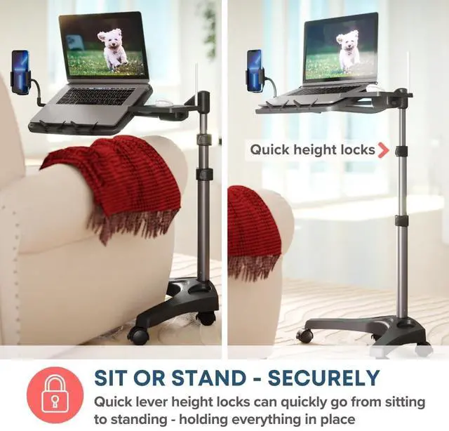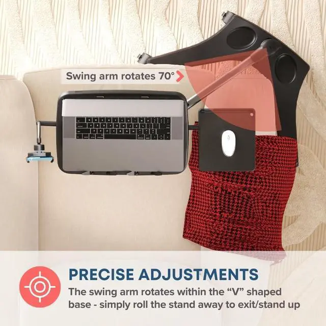 The locking joints hold your device steady as you write, draw, or scroll. Built from aluminum and tough polymer to combine lightweight handling with long-term strength. ^^ INCLUDES MOUSE TRAY AND PHONE HOLDER Our workstation arrives complete with thoughtful accessories that keep essentials within reach. The side mouse tray works for right- or left-handed users, while the adjustable phone holder keeps calls and messages visible. Stay organized during Zoom sessions, creative projects, or cozy movie nights. ^^ STABLE BASE WITH EASY MOBILITY Heavy-duty frame and wide base on four smooth-rolling casters support up to 7 lbs.