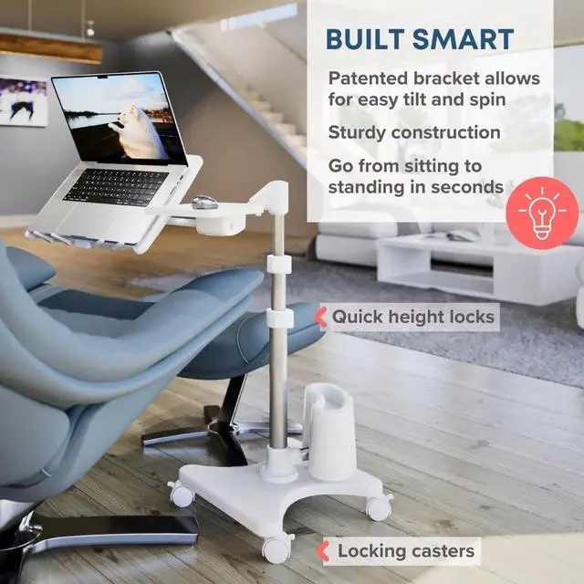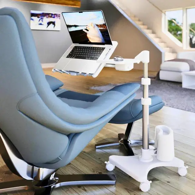 Patented swing-arm and tilt design offer unmatched flexibility, making it the ultimate workstation for leisure or productivity. ^^ FITS MOST DEVICES & TILTS 070 FOR ERGONOMIC VIEWING Holds notebooks up to 16 wide (5 lb max), plus tablets, sketchpads, books, or documents. Tilts from flat to 70 degrees for ideal posture whether sitting, reclining, or lying down. Includes safety bungee to secure your device at any angle. Adjusts quickly between seated and standing positions, making it a versatile mobile workstation for home or office. ^^ PREMIUM ROLLING DESK WITH ERGONOMIC DESIGN Built from anodized aluminum and durable polymers for long-lasting strength.