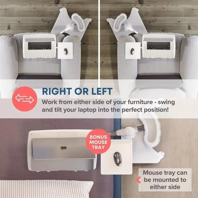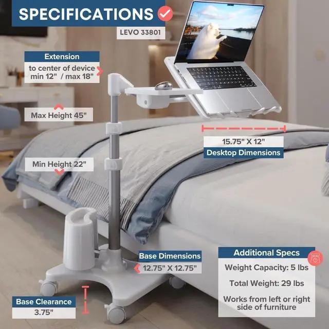 Space-saving base hugs furniture corners while the swing arm extends over your lap. Locking casters make moving between rooms easy. Patented mouse tray stays level when swiveling and can be positioned left or right. Designed from decades of user feedback for comfort and stability. ^^ TRUSTED FAMILY-OWNED BRAND SINCE 1998 BUILT FOR REAL USERS LEVO combines over 25 years of ergonomic innovation with exceptional service. Loved by students, professionals, caregivers, and parents. Check the SPEC sheet in the images for fit. Perfect for improving posture, comfort, and productivity.