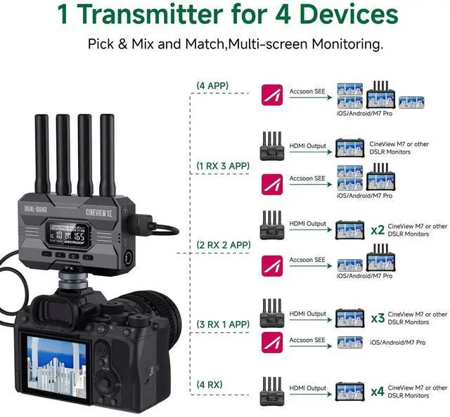 Seamless Collaboration: One transmitter can connect to up to 4 receivers, including standard receivers and mobile devices, ensuring the entire crew stays in sync. Additionally, it is compatible with the CineView HE/Quad/2 SDI/M7 Pro camera field monitor, offering extended functionality for advanced workflows ^^ Professional Monitoring & RTMP Live Streaming: The CineView SE integrates seamlessly with the Accsoon SEE App, providing professional-grade monitoring tools such as RGB, Audio Level, Histogram, Waveform, Focus Peaking, LUTs, and more. It also supports RTMP live streaming, allowing direct broadcasting to platforms like YouTube, Facebook, and Twitch ^^ Versatile
