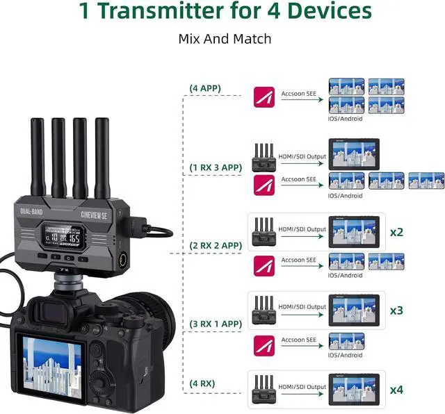 Seamless Collaboration: One transmitter can connect to up to 4 receivers, including standard receivers and mobile devices, ensuring the entire crew stays in sync. Additionally, it is compatible with the CineView HE/Quad/2 SDI/M7 Pro camera field monitor, offering extended functionality for advanced workflows ^^ Professional Monitoring & RTMP Live Streaming: The CineView SE integrates seamlessly with the Accsoon SEE App, providing professional-grade monitoring tools such as RGB, Audio Level, Histogram, Waveform, Focus Peaking, LUTs, and more. It also supports RTMP live streaming, allowing direct broadcasting to platforms like YouTube, Facebook, and Twitch ^^ Versatile