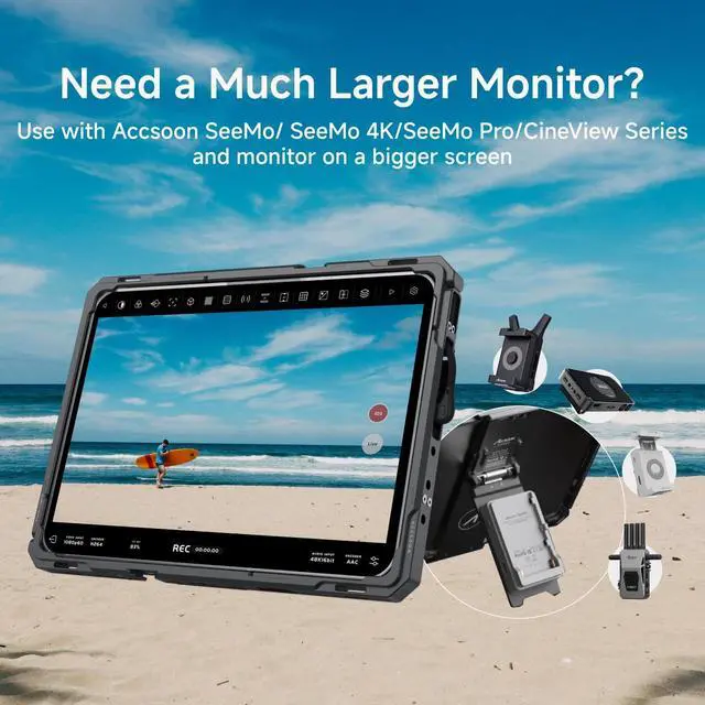 Turn your iPad into larger monitor: A compatible iPad Pro connect to the Accsoon SeeMo using the new ipad PowerCage Pro, and then you have a pro-grade director's monitor with all the same great app tools ^^ Keep the iPad
