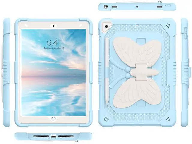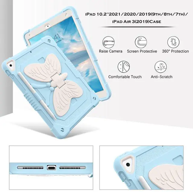 YINLAI Case for iPad 9th 8th 7th Generation 10.2 Inch, iPad air 3rd Case with Pencil Holder Butterfly Kickstand Kid Girl Shockproof Protective Cover for iPad 9 8 7 Gen 2021/2020/2019, Blue