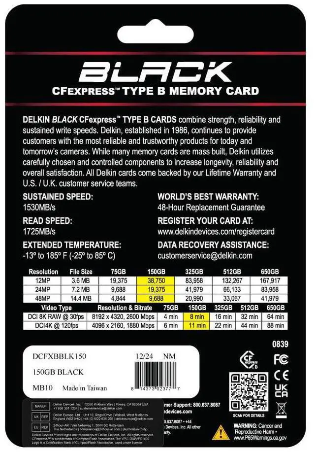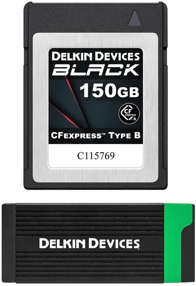 Delkins BLACK CFexpress Type B card and reader deliver pro-level speed and reliability. Capture flawless 8K/6K/4K with up to 1725MB/s read, 1240MB/s write. pSLC flash ensures durability; rugged, shockproof, and water-resistant. The dual-slot reader supports CFexpress Type B & SD UHS-II, with 10Gbps USB 3.2 speeds. Includes USB-C & USB-A cables. Compact, cross-platform, serialized, and backed by a lifetime warranty with 48-hour replacement.
