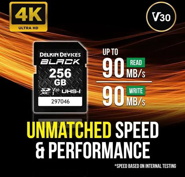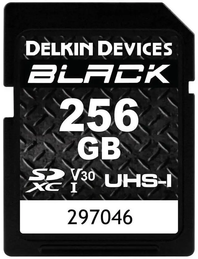 The Delkin Devices BLACK UHS-I (U3/V30) SD Memory Card offers unmatched durability, reliability, and high performance, making it ideal for DSLRs and advanced camcorders. Engineered to be 3X stronger than regular SD cards, its proprietary injection-molded design withstands over 45 pounds of impact while being dust, water, and shock-proof, with an extreme temperature range of -25C to 85C. The ribless, switch-free design enhances reliability by preventing accidental write-protect issues. With V30 speed rating, it delivers recording speeds over 90MB/s for smooth 4K, 3D, and Full HD video capture, ensuring no dropped frames.
