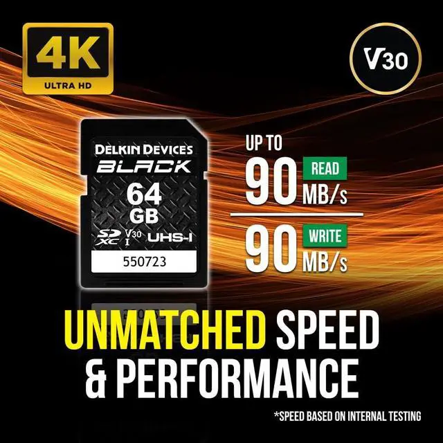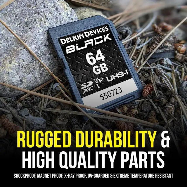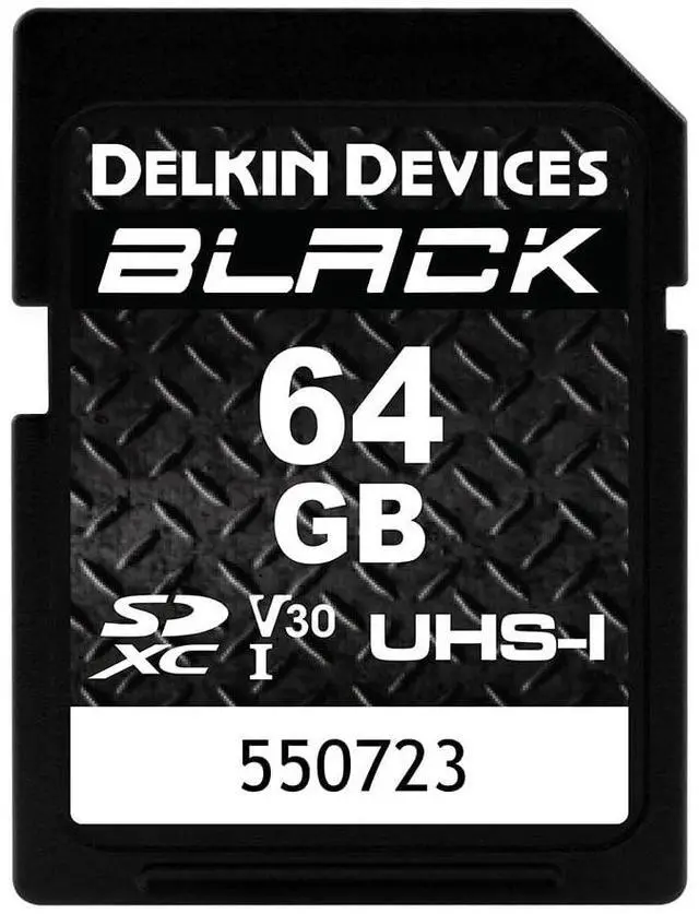 The Delkin Devices BLACK UHS-I (U3/V30) SD Memory Card offers unmatched durability, reliability, and high performance, making it ideal for DSLRs and advanced camcorders. Engineered to be 3X stronger than regular SD cards, its proprietary injection-molded design withstands over 45 pounds of impact while being dust, water, and shock-proof, with an extreme temperature range of -25C to 85C. The ribless, switch-free design enhances reliability by preventing accidental write-protect issues. With V30 speed rating, it delivers recording speeds over 90MB/s for smooth 4K, 3D, and Full HD video capture, ensuring no dropped frames.