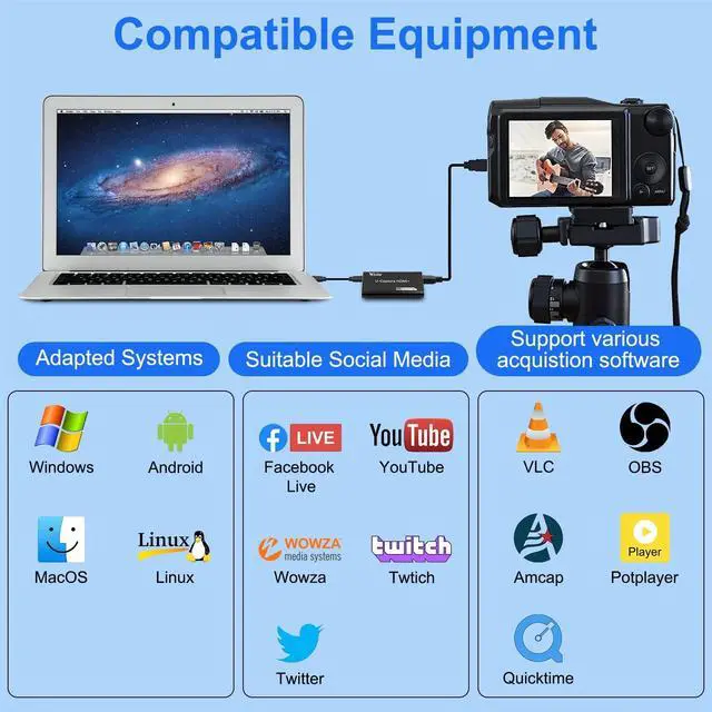 ^^ Compatible with Multiple SystemsSuitable for Windows, Linux, Mac OS, etc. Support YUY2, High speed USB 3.0 technology and superior low latency technology makes it easier for you to transmit live streaming to Twitch, Youtube, Facebook, Twitter, OBS, Potplayer and VLC. ^^ Wide CompatibilityHDMI input port compatible with most HDMI source devices, such as Camera, Webcame, DSLR, Switch, TV BOX, PS3/4/5, Xbox One, etc. At the same time, suport 4K30Hz HDMI signal loopout. You can view the video on the big screen and enjoy higher visual effects.