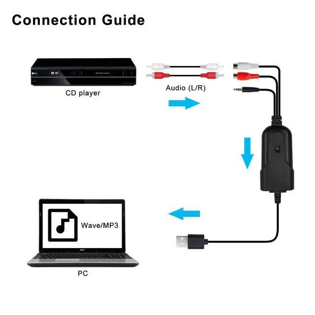 Versatile: Capture audio from various sources like Tape, MD, Phono, CD player with this USB audio capture card.