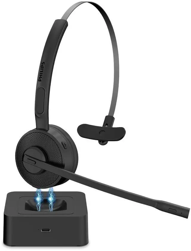 The Philips TAL3000 Bluetooth Headset is built for professionals who need clear communication and lasting comfort whether in the office, on the road, or working remotely. This wireless headset with mic features a noise-canceling microphone that filters background noise for crystal-clear calls and meetings. Designed with a lightweight, adjustable frame and a flip-away mic, it offers flexible all-day wear. Dual Bluetooth connectivity lets you connect two devices simultaneouslyperfect for switching between your phone and computer headsetwhile on-headset controls make it easy to mute, adjust volume, or activate voice assistants like Siri or Google Assistant for hands-free operation.