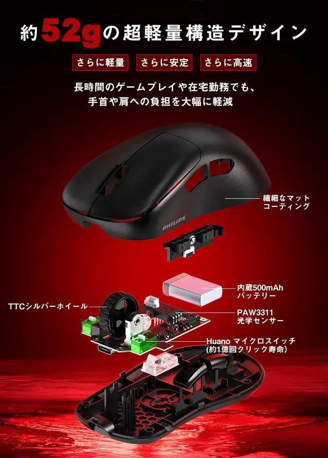 PHILIPS SPK9418 Wireless Gaming Mouse, Adjustable 12000 DPI Bluetooth Mouse for Gaming, Wired/ 2.4G hz/Bluetooth Ultra-Lightweight with 5 Programable Buttons, Rechargeble Battery