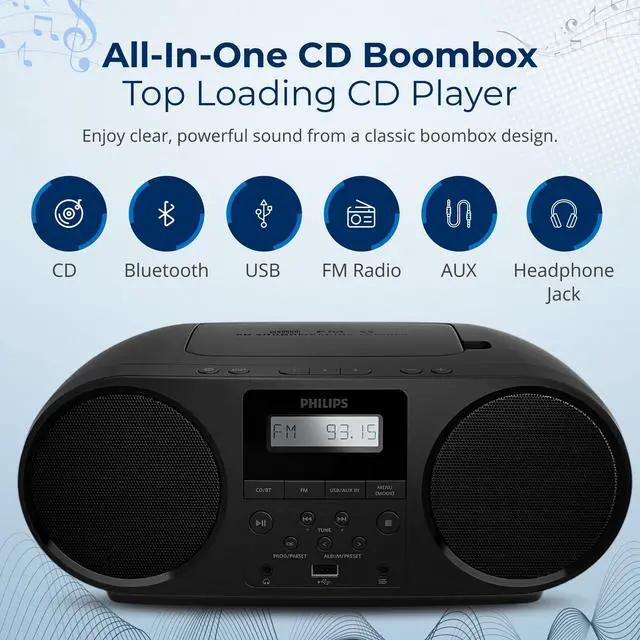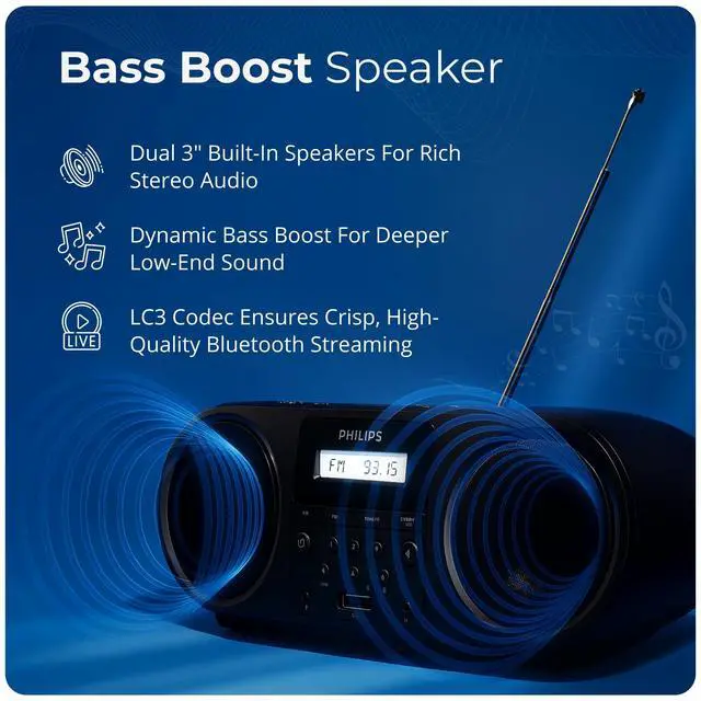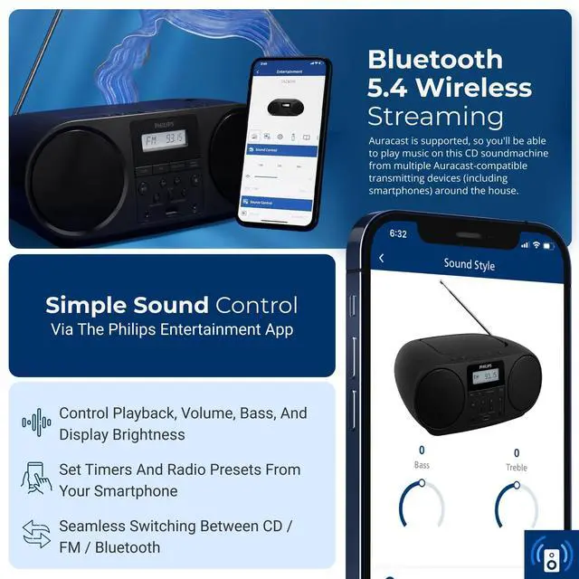 Powerful Stereo Sound Performance Experience room-filling audio with dual front-facing speakers engineered for loud, clear, and balanced sound. Perfect for parties or personal listening, this Philips boombox delivers exceptional volume and clarity across CDs, radio, USB, and AUX input. ^^ Bluetooth with Auracast Streaming Enjoy wireless freedom with built-in Bluetooth, supporting Auracast streaming for superior audio quality and stable connectivity. Easily pair smartphones, tablets, or laptops to stream playlists without cables while maintaining high-fidelity sound. ^^ Smart Control with Philips App Manage your music effortlessly with the Philips app, giving you remote access to playback, volume, and EQ settings.