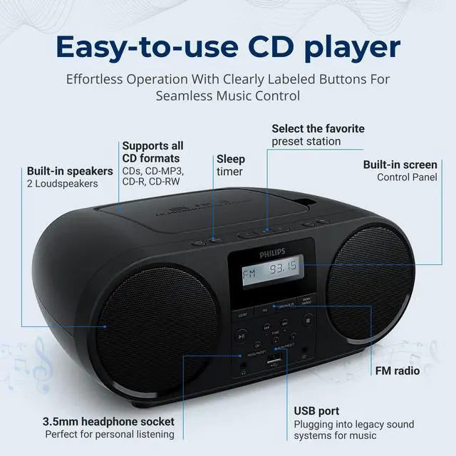 Adjust sound, switch between modes, or program your CD tracks directly from your smartphone for added convenience. ^^ Versatile Playback and FM Presets Play CDs, CD-R, and MP3 discs, connect USB drives, or use the AUX input for external devices. The integrated FM tuner with digital presets lets you save favorite stations, while programmable CD playback customizes your track order. ^^ "Portable Design with Dual Power Options Lightweight and easy to carry with a built-in handle, this boombox is designed for music on the go. Use AC power indoors or batteries outdoors for flexible portability, whether at home, in the park, or traveling.