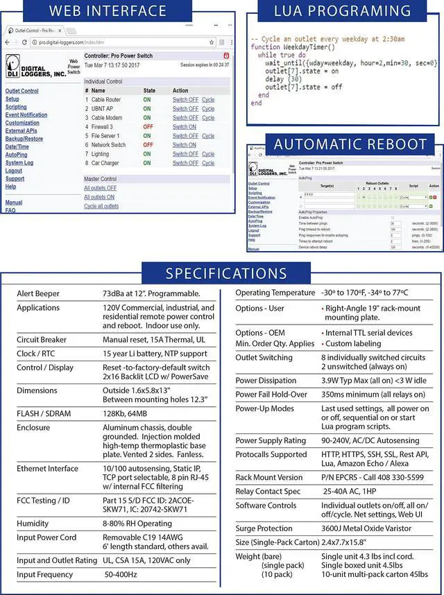 Updated model with 6 foot detachable power cord and heavy duty power supply. Keypad for local outlet control and setup. Both wired Ethernet and WiFi for reliable control. AutoPing to automatically reboot routers, APs and IP cameras. Internal clock for programmed scheduling. Rest API online for simple, quick development of your own custom script or application. Fully programmable using Lua. Eight individual circuits provide up to 15A of total power. Two un-switched outlets. Multiple power-up recovery modes for safety and flexibility: timed sequential on all-off last state, custom timed sequence, etc. Low power - less than 4 watts. New design heavy duty power supply and detachable power cord included. Supports HTTPS, SSL, SSH, Rest API, cURL, SYSLOG, NTP, SNMP, MODBUS and more. Alexis/Echo compatible. Eligible for free 5 year warranty when purchased from DLI Direct via Amazon and registered.